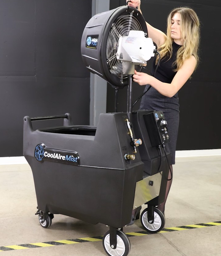The CoolAire Spirit mobile fogging system provides portable evaporative cooling, humidification, and chemical fogging for manufacturing facilities, warehouses, industrial workspaces, and other environments where OSHA-compliant guarding and quieter airflow are preferred.