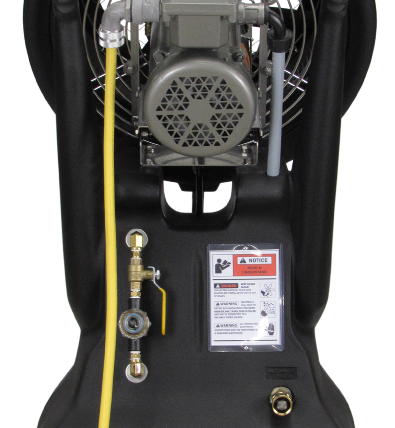 The HRSM-EXP includes an 18-gallon integrated supply tank, rugged wheeled chassis, and 4-position pivoting fogging head. Water flow is regulated by a quarter-turn ball valve and the system can be operated continuously or automated using a secondary hazardous-duty controller (where applicable).